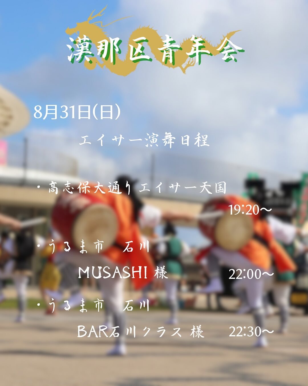 8月31日 演舞日程🐲 高志保大通りエイサー天国への4年連続での出演の機会を賜り、誠にありがとうございます。🙇🏻 旧盆前の大切な催しで演舞できることを光栄に思っております。青年会一同、地域の皆さまに楽しんでいただけるよう全力で盛り上げてまいります🔥 #漢那区青年会 #宜野座村 #高志保エイサー天国 #エイサー
