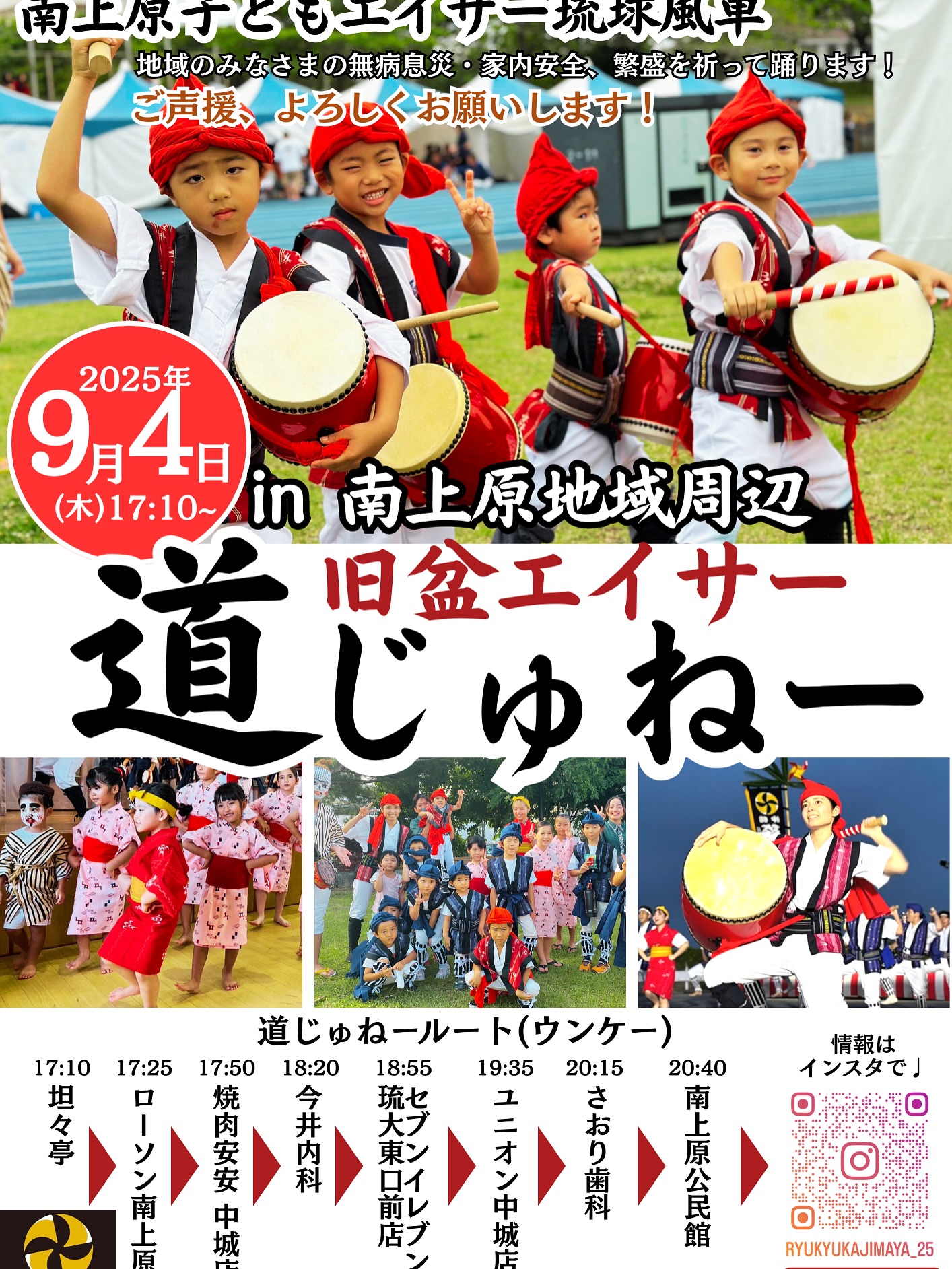 \9月4日(木) ウンケー/ 明日✨ 道じゅねーします⭐︎ 🌼ルート ①17:10-17:15 坦々亭様 ②17:25-17:33 ローソン南上原店様 ③17:50-17:55 安安様 ④18:20-18:28 今井内科様 ⑤18:55-19:05 セブンイレブン琉大東口店様 ⑥19:35-19:55 ユニオン中城店様 ⑦20:15-20:25 さおり歯科様 ⑧20:40-21:00 南上原公民館 約30名の子どもたちと 琉球風車メンバーの力強いエイサー ご声援宜しくお願い致します✨ エイエイサー✊ #旧盆エイサー #道じゅねー #エイサー #琉球風車 #子どもエイサー #南上原子どもエイサー