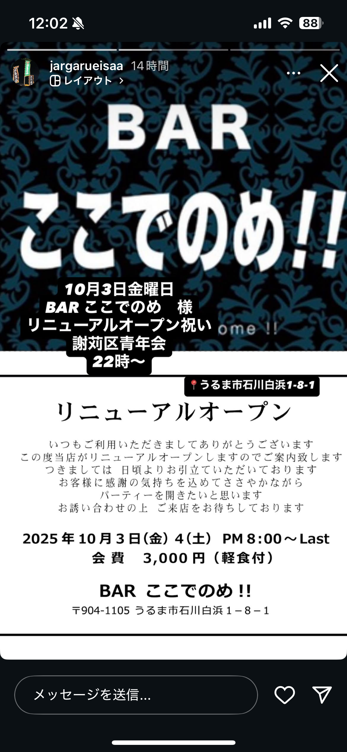 BAR ここでのめ!! リニューアルオープン祝い - 2025年10月3日 BAR ここでのめ!! | エイサーマップ 2026