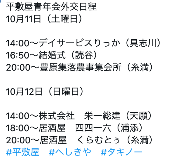 平敷屋青年会外交日程 10月11日(土曜日) 14:00〜デイサービスりっか(具志川) 16:50〜結婚式(読谷) 20:00〜豊原集落農事集会所(糸満) #平敷屋 #へしきや #タキノー 近隣住民や店舗のご迷惑になる路駐などはご遠慮ください 平敷屋青年会10月18日土曜日で今年ラスト外交です。今年も残りわずかですが最後まで応援よろしくお願いします🙇