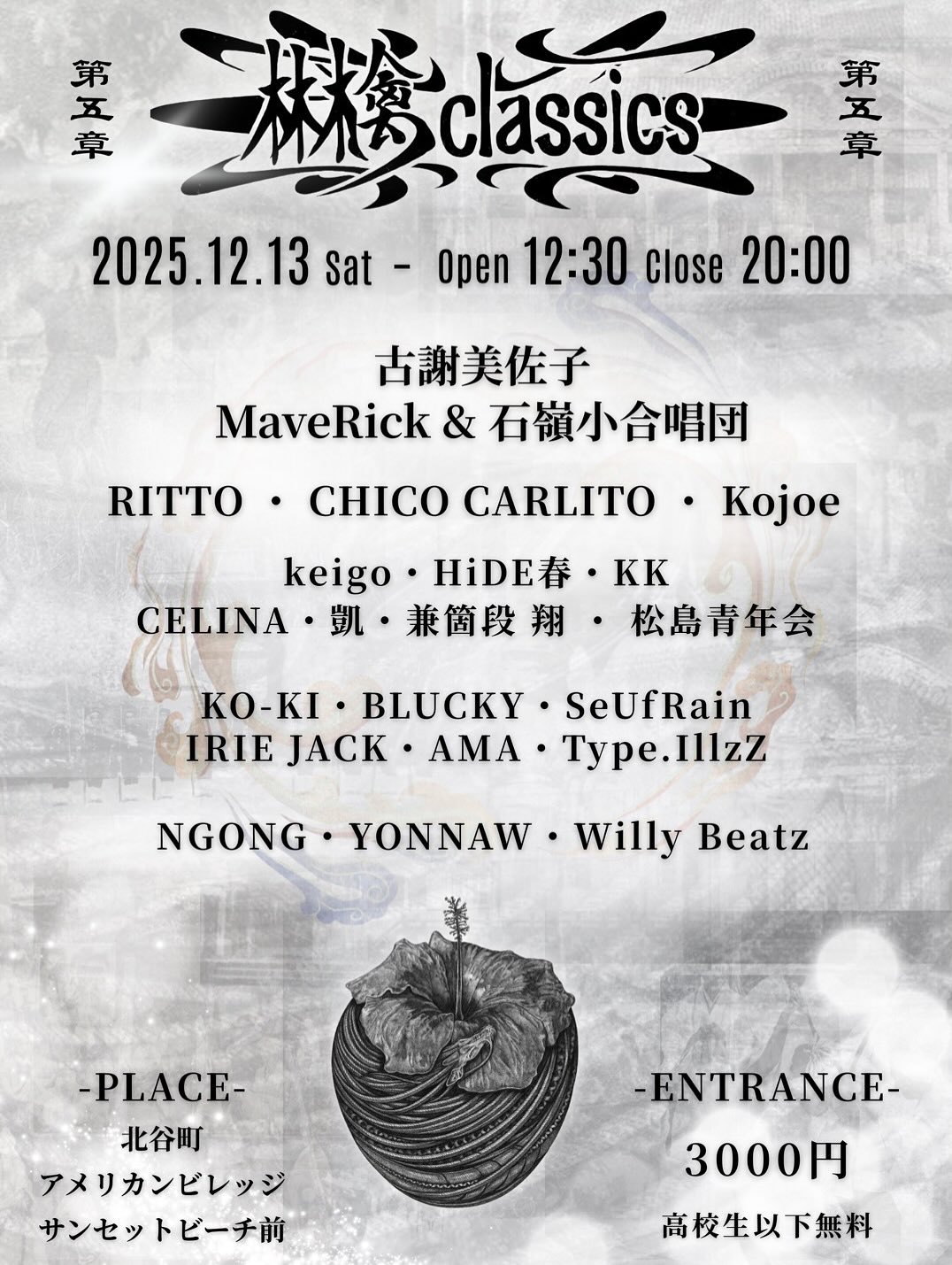 -林檎𝐜𝐥𝐚𝐬𝐬𝐢𝐜𝐬 第五章 - 【𝗗𝗔𝗧𝗘】 2025.12.13(sat.) 【𝗢𝗣𝗘𝗡】 12:30-20:00 【𝗣𝗟𝗔𝗖𝗘】北谷町アメリカンビレッジ サンセットビーチ前 【𝗘𝗡𝗧𝗥𝗔𝗡𝗖𝗘】 3000円(高校生以下無料) 【𝗔𝗥𝗧𝗜𝗦𝗧𝗦】 古謝美佐子 MaveRick & 石嶺小合唱団 @maverick_99_oki RITTO @rittokinawa CHICO CARLITO @chicocarlito1993 Kojoe @iamkojoe Keigo @keigo_8131 HiDE春 @hideharu_official KK @jz94_kk CELINA @celi___na99 凱 @_____gai_____ 兼箇段翔 @kakeru_kanekodan 松島青年会 KO-KI @kokikoki__22 BLUCKY @b.l.u.c.k.y SeUfRain @seufrain_lati381 IRIE JACK @__iriejack AMA @amaaaaaaa1001 Type. IllzZ @typeillzz 【𝗗𝗝】 NGONG @ngong_aspr YONNAW @djyonnaw Willy Beatz @willy_4306 【𝗔𝗥𝗧𝗪𝗢𝗥𝗞】 天描画家 大城清太 みなさんのご来場心よりお待ちしてます🍎