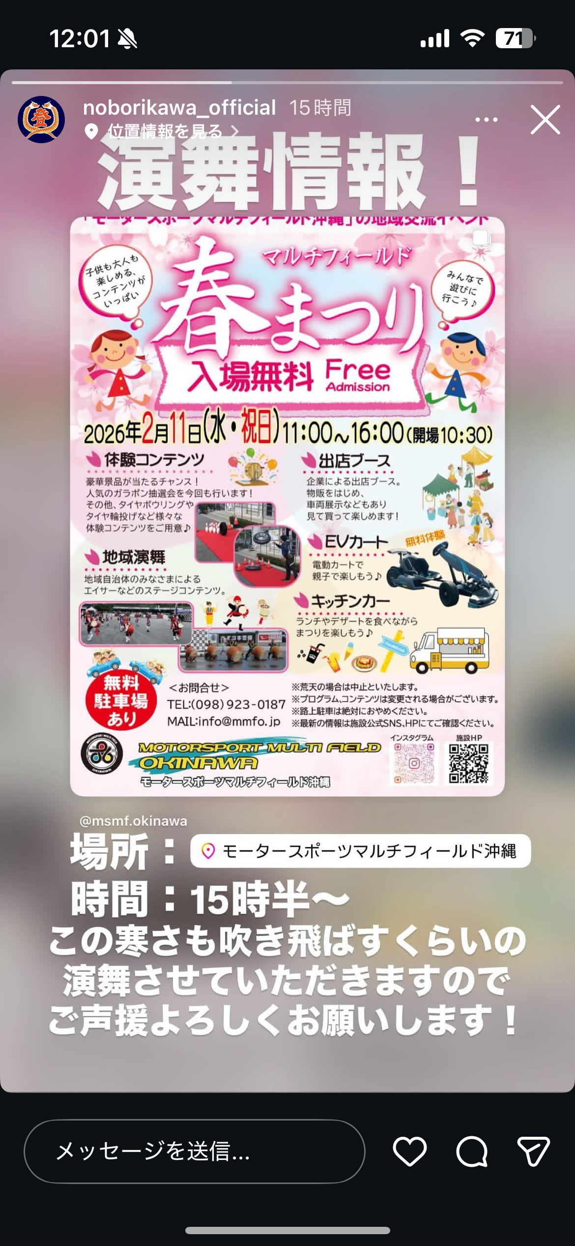 マルチフィールドのイベント情報!📢 今年も開催!【入場無料!マチフィールド春まつり🌸】 -開催概要- 日時:2026年2月11日(水・祝) 11:00~16:00 (開場10:30) 会場:モータースポーツマルチフィールド沖縄 ※会場内に駐車場があります 料金:入場料無料 協力:登川自治会、知花自治会、池原自治会、松本自治会 当日はEVカートが「無料」で体験できちゃいます🏎️! ※乗車制限がございます。 プログラムでは各自治会による琉舞、エイサー等の演目の他、自治会対抗戦などを実施予定! 協賛企業様、周辺企業様の出展やキッチンカーもあるので見て・体験してイベントをお楽しみください^^♪ ご家族・ご友人そろってのご来場お待ちしています。 最新情報はSNSで更新中!お見逃しなく😉✨ #モータスポーツマルチフィールド沖縄 #春まつり #春祭り#evカート #電動カート #キッチンカー #出展 #エイサー