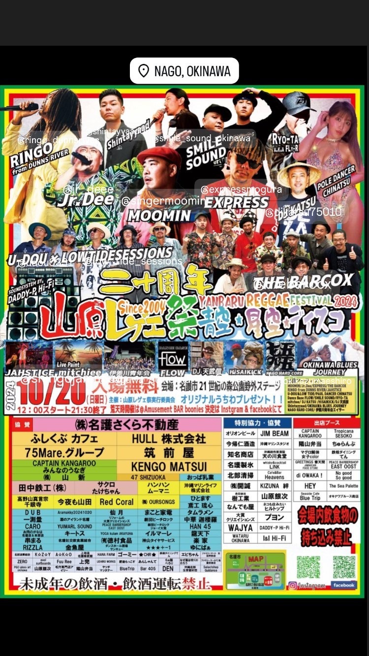 二十周年 YANBARU REGGAE FESTIVAL 2024 山原レゲエ祭 青空⭐︎星空⭐︎ディスコ 10/20(日) 入場無料 会場:名護市21世紀の森公園野外ステージ 12:00スタート〜21:30終了 出演アーティスト Jr.Dee MOOMIN EXPRESS RINGO from どんずりばー U-DOU x LOWTIDE SESSIONS THE BARCOX RYO-TA A.K.A FLY-R JAHSTICE OKINAWA BLUES JOURNEY NAGO HARD CORE 出演サウンド SMILE SOUND Shintayyaad HiSAIKICK DJ KATSU DJ 天武信 ダンス DANCE BASE FLOW ポールダンス CHINATSU エイサー 伊佐川青年会 Live Paint micthee SOUNDSYSTEM by DADDY-P Hi-Fi I&I Hi-Fi @singermoomin @ringo_dunnsriver @udou0331 @thebarcox @smile_sound_okinawa @shintayyaad098 @hisaikick @cuppa.hsk @djkatsu75010 @shingojamming